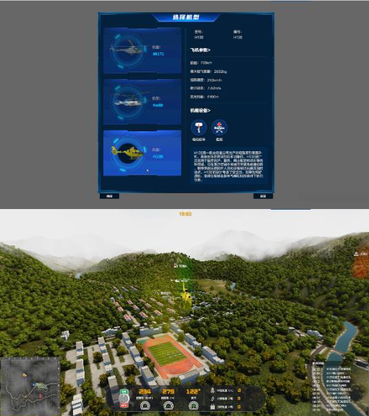 基于假想的典型航空应急救援虚拟任务场景,参赛队以航空救援队的身份,面对多种险情需求,完成救援任务。每个参赛队需要派出3名队员操作系统 ,包括1名指挥员和2名飞行员,指挥员选择指挥中心,2名飞行员各选择1架救援飞行器,随后进入同一任务场景,指挥员拥有救援指挥中心全局态势视角,可以通过标记的方式进行任务规划,并能将规划标记同步给飞行员,飞行员以第一人称视角操控飞行器进行航空救援任务,每局救援任务结束后,系统自动生成参赛队的任务效能值。