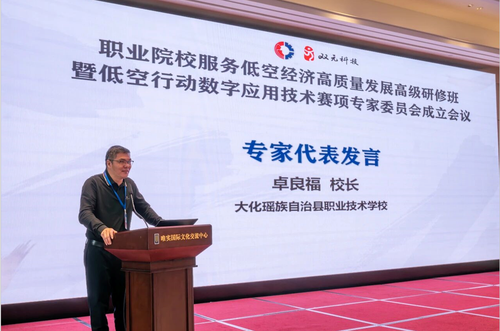 大化瑶族自治县职业技术学校卓良福校长作为专家代表发言,分享了过去自身成长和专业建设中不断学习的探索与实践。面对低空经济这样新的机遇和挑战,他表示,学校将积极对接产业需求,通过专业优化与课程改革推动人才培养,并主动组织师生参与相关赛项,以赛促学,为低空经济发展输送高素质技能人才。