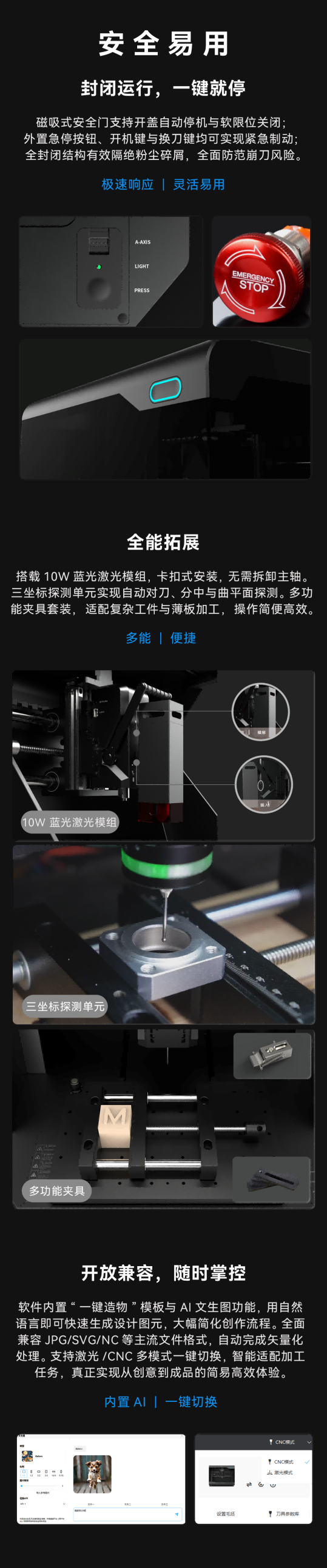 便携式四轴数控雕铣激光一体机(简称:钻石Mini)【ICNC-Mini】是一款集高精度、多功能与模块化扩展于一体的桌面级智能CNC设备。采用一体铸铝底座与全景可视外壳,兼顾运行稳定与操作安全;280×200×80mm加工幅面搭配80mm可通过高度,满足中小型工件主流需求。搭载250W快换主轴与滚珠丝杆传动系统,支持3秒换刀,实现±0.02mm精密雕刻与1000mm/min高效加工,轻松应对PCB、软金属、木材、亚克力等多种材料。内置数字化数控铣雕智能操作控制系统,支持USB/WiFi双模连接,兼容全平台设计工具。可使用第四轴、激光模块、三坐标测头等丰富的扩展功能,是进阶创客、教育实训与轻工业用户的理想之选。
